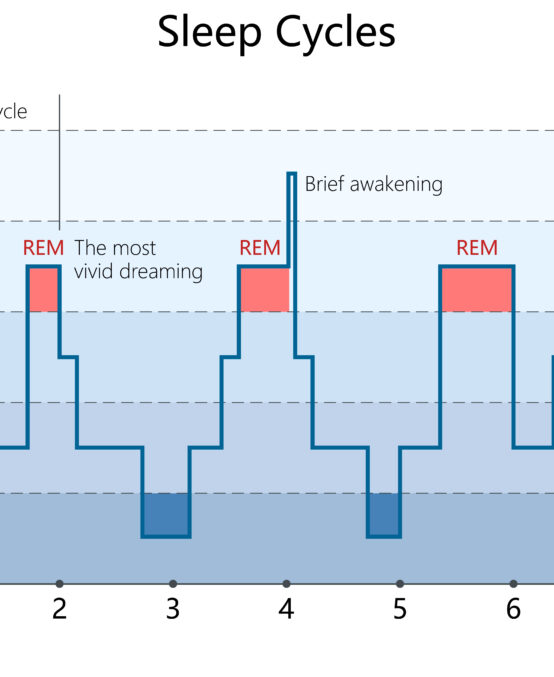 While you sleep, an EEG monitors your sleep stages and the cycles of REM and non-REM  sleep you go through during the night, to identify possible disruptions in the pattern of your sleep. A sleep study will also measure things such as eye movements, oxygen levels in your blood (through a sensor—there are no needles involved), heart and breathing rates, snoring, and body movements.
